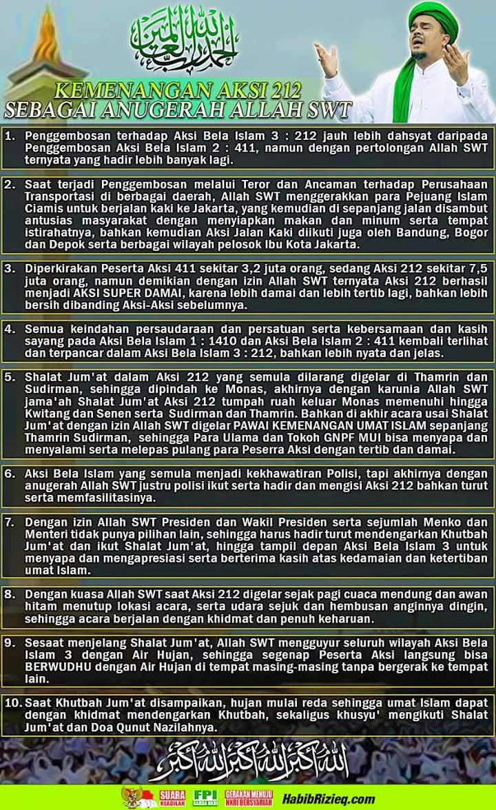 5. Shalat Jum’at dalam Aksi 212 yang semula dilarang digelar di Thamrin dan Sudirman, sehingga dipindah ke Monas, akhirnya dengan karunia Allah SWT jama’ah Shalat Jum’at Aksi 212 tumpah ruah keluar Monas memenuhi hingga Kwitang dan Senen serta Sudirman dan Thamrin. Bahkan di akhir acara usai Shalat Jum’at dengan izin Allah SWT digelar PAWAI KEMENANGAN UMAT ISLAM sepanjang Thamrin Sudirman, sehingga Para Ulama dan Tokoh GNPF MUI bisa menyapa dan menyalami serta melepas pulang para Peserra Aksi dengan tertib dan damai.